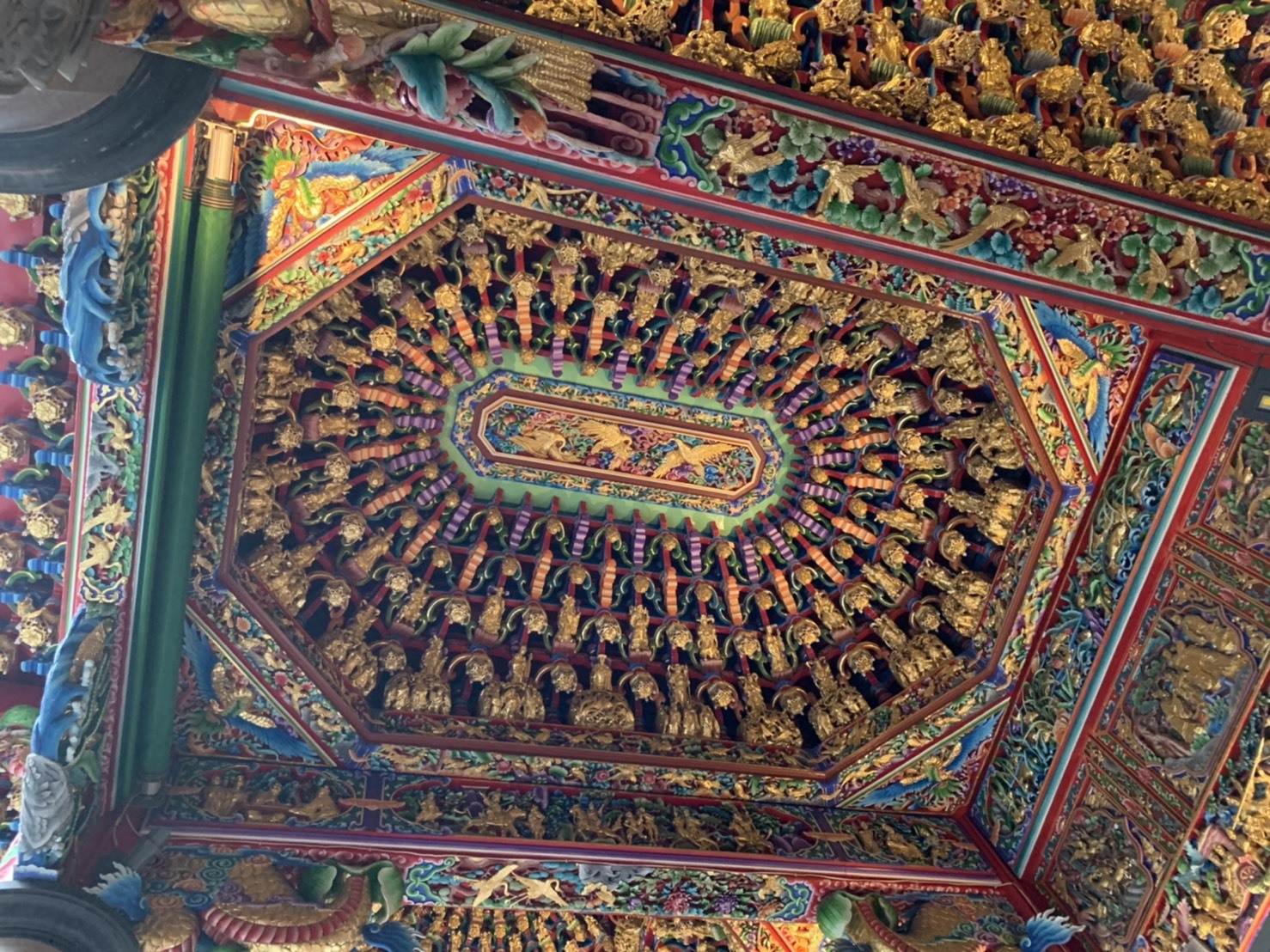 藻井類似家中的天花板,每一塊的形狀都是不一樣的,它有四角形、八角形,還有圓形結網三種。藻井的形狀不同,是因為製作的師傅會由自己去創造,大部分都是用神明、花、鳥、龍、鳳形象去雕刻而成。